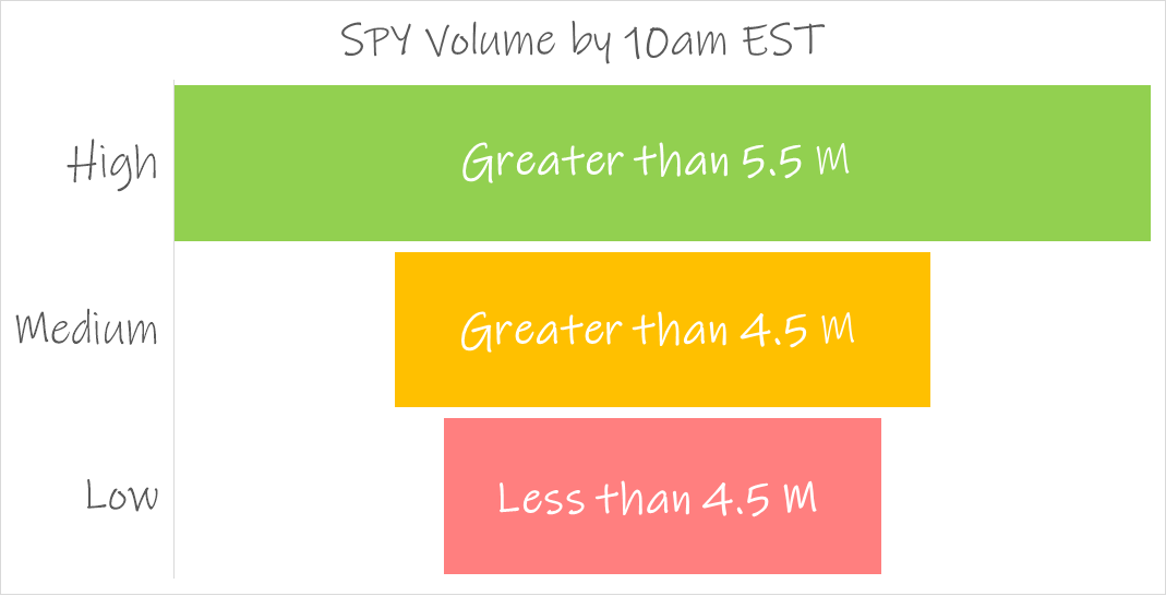 A volume of 5.5 million shares or more for SPY by 10 AM EST is desirable because it indicates strong liquidity and investor engagement, facilitating smoother trades and potentially signaling market momentum.