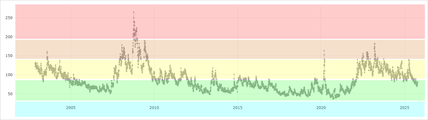 The MOVE Index uses an options-pricing model based on a weighted average of option probabilities to reflect collective expectations for future volatility in the fixed income market. Diving deeper, the MOVE measures the implied yield volatility of a basket of one-month, over-the-counter options on 2-year, 5-year, 10-year, and 30-year Treasuries.