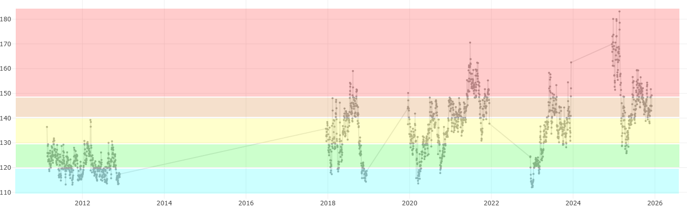 CBOE Skew Index, a measure of the perceived tail risk of the distribution of S&P 500 investment returns over a 30-day horizon. The index values are calculated and published by the Chicago Board Options Exchange based on current S&P 500 options market data. SKEW is similar to the VIX index, but instead of measuring implied volatility based on a normal distribution, it measures an implied risk of future returns realizing outlier behavior.